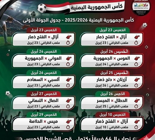 أنجز الاتحاد اليمني لكرة القدم اليوم، مراسم قرعة بطولة كأس الجمهورية للموسم 2025/2026، واضعاً اللمسات الأخيرة على توزيع أبطال المحافظات (الدرجة الثالثة) ليكتمل نصاب الفرق المشاركة بـ 64 نادياً، في عرس كروي وطني تنتظره الجماهير بشغف.